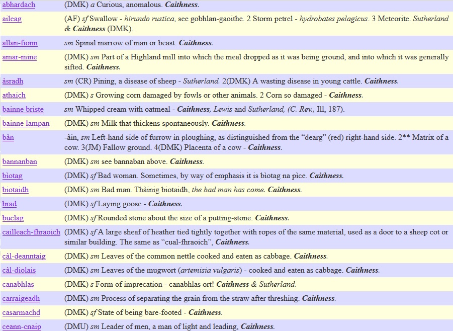 Assynt is one of those areas which seems somehow to have escaped the academic eye. When it comes to the far north of Scotland, you can start in the south of Rosshire and work your way up, finding most dialects covered by a monograph or a dictionary or a collection of some kind. Only Assynt and Caithness –ironically the two areas which initially interested me because of my family connections- have been left unexamined. I am currently going through the Gaelic Linguictic Survey entries for south Caithness with a fine-toothed comb and finding some very interesting features, especially in comparison with neighbouring dialects. Houston, we have an isolate! Other than that, Caithness will prove a difficult one given the lack of supplementary poetry, song or vocabulary, despite the bonus of 126 specifically dialect entries in Dwelly!